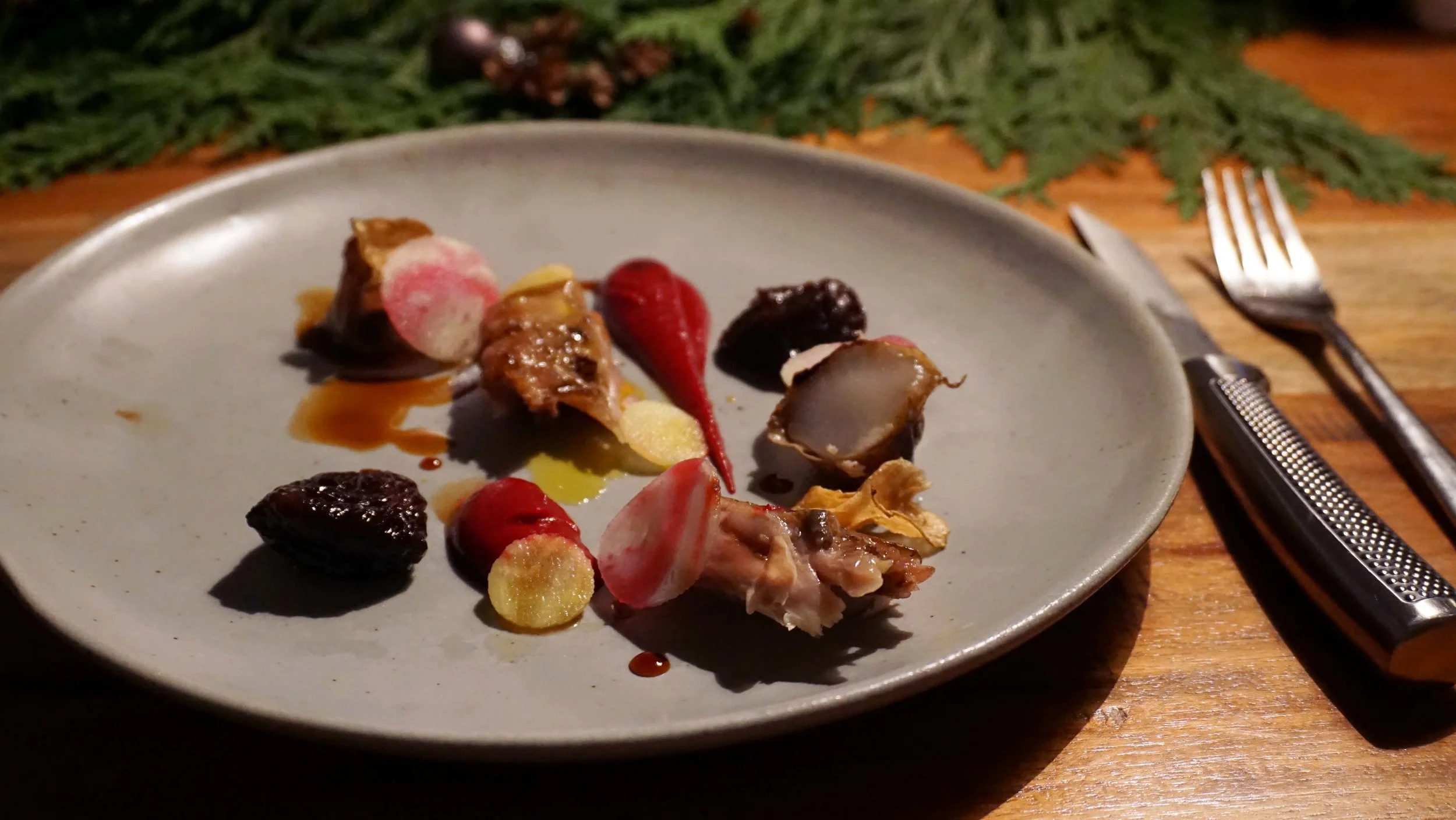 Confit Turkey Leg, Beet, Sunchoke, Prunes in Pedro Ximenez