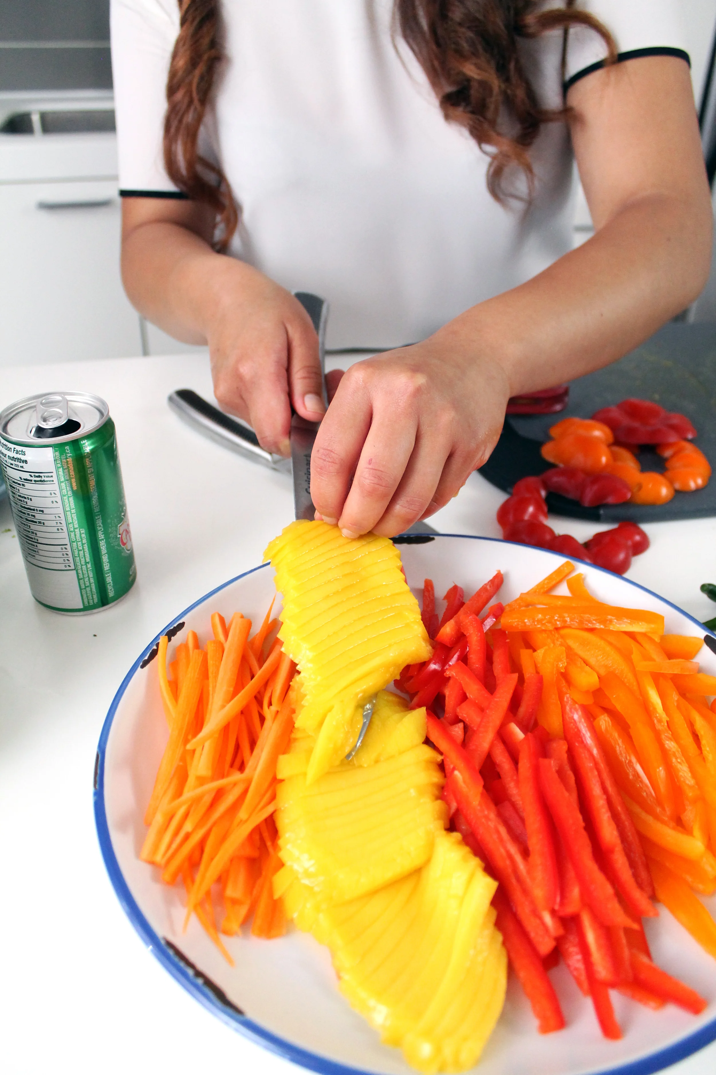 Slice the mango, bell peppers, and carrots into thin strips and set aside.