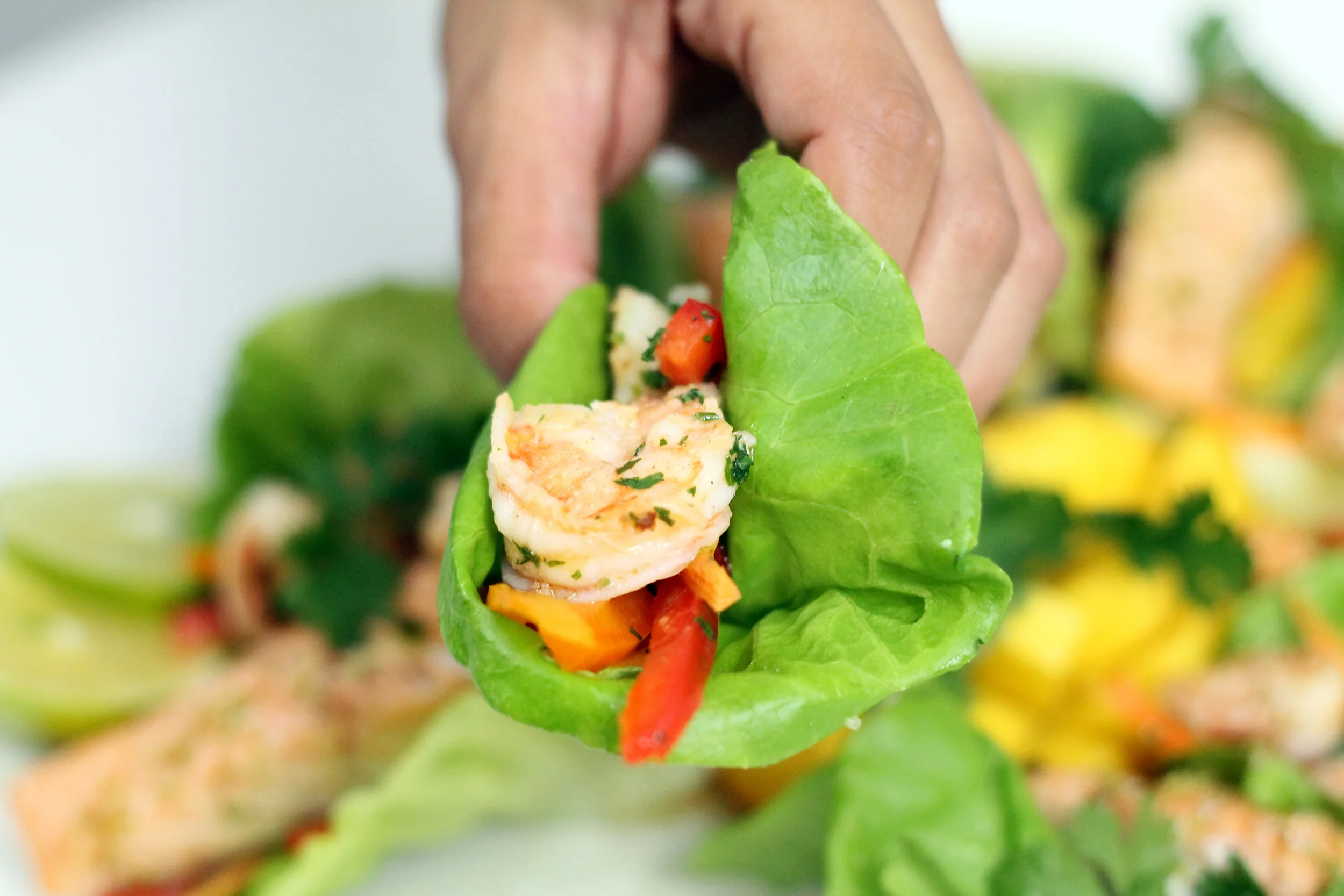 Once the protein is cooked you can dress the salad, making sure to toss so all the veggies are well-coated. To assemble the wraps take a leaf of lettuce and load it up with a scoop of salad, then top with either a portion of salmon or a few shrimp. Serve immediately!