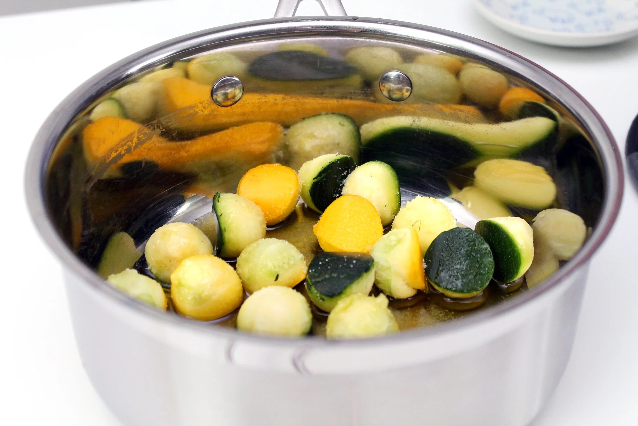 Create cute little half-spheres of zucchini using a melon baller. Toss them into a small sauce pan and add some olive oil and salt. Put the lid on and let them steam for a few minutes until fork tender.