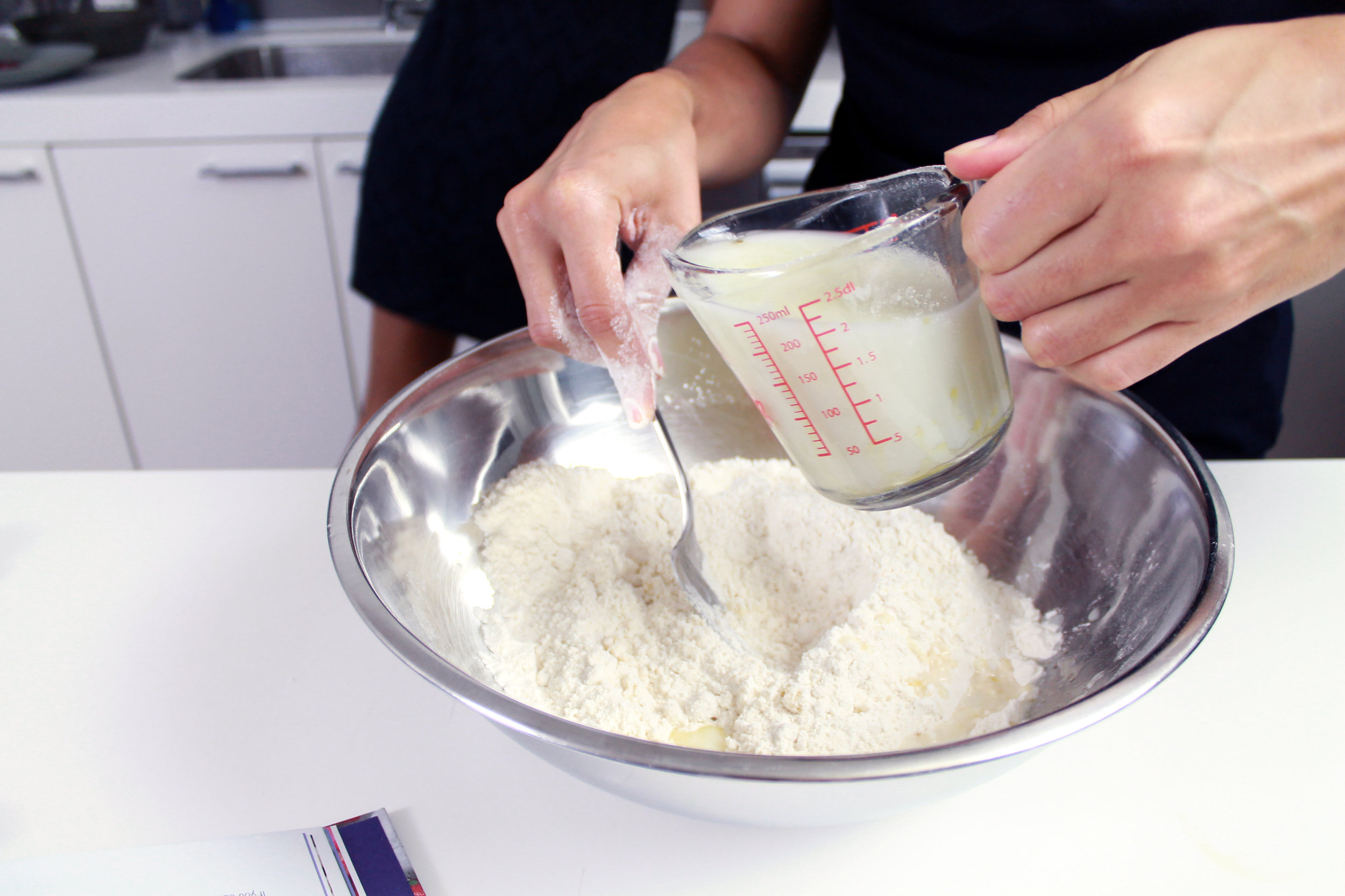 While the soup was simmering we moved on to the kale scones. Fresh kale and onions were fried up in olive oil and added to the dry ingredients. Olive oil was used instead of a solid fat like coconut oil or shortening, but the scones still had light fluffy layers.