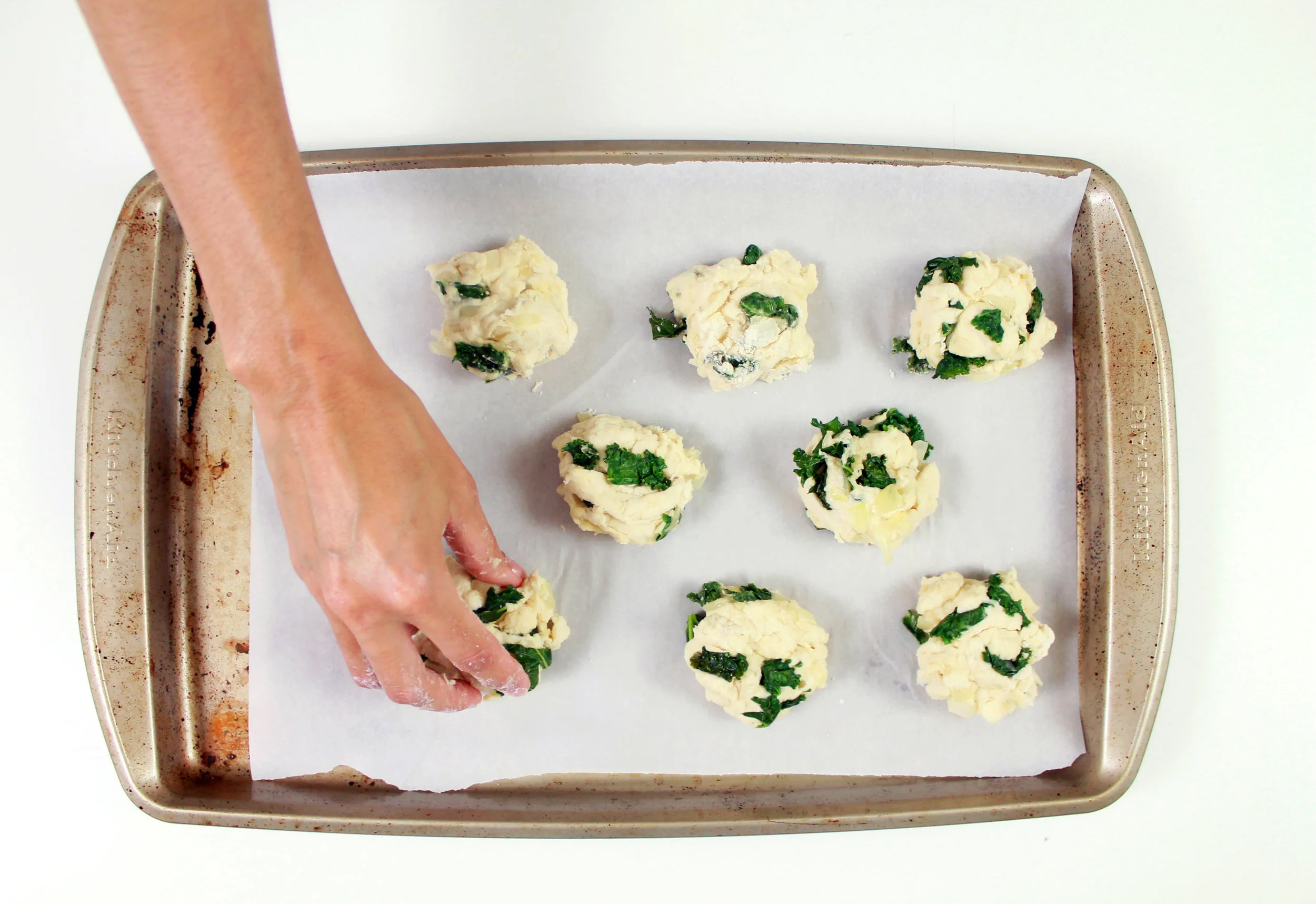 Instead of nut milk in this recipe we used Rice Dream rice milk, my favorite. Nicole kneaded the mixture until it formed a ball and the kale and onions were evenly distributed throughout the dough. Then she pinched off little handfuls and shaped them into scones. She baked them off on a parchment-lined tray until nice and golden brown.
