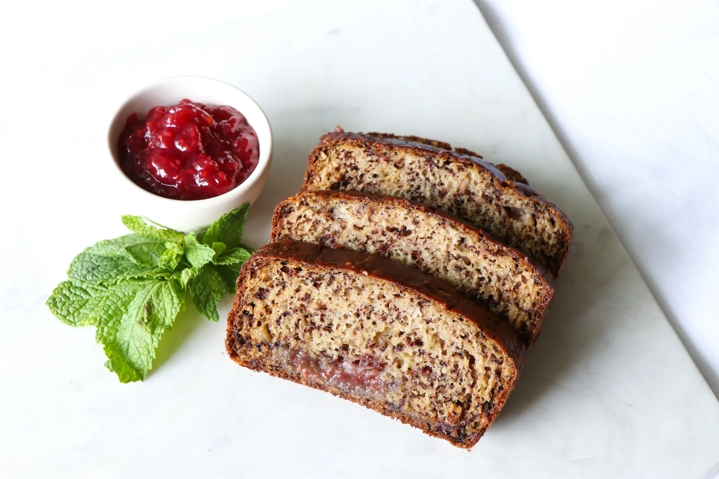 Pour half the batter into a loaf pan. Spoon the jam down the center of the batter from one end of the pan to the other, lengthwise. Then spoon the rest of the batter over top and smooth it out so it's nice and even.