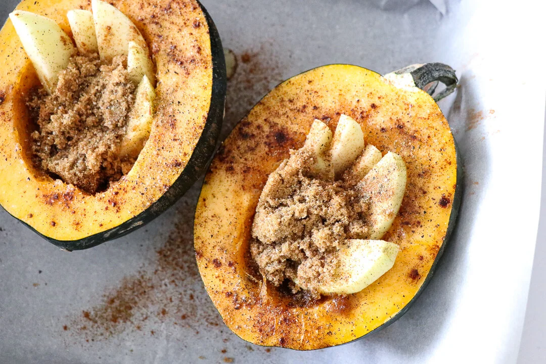 Cut the Squash in half and scoop out the seeds. Brush the flesh with olive oil. Line a square baking dish with parchment paper and place the halves inside. Place several slices of apple in the center of each half, then spoon 1 tbsp of brown sugar on top. Sprinkle the spices evenly over everything, and season with salt and pepper. Bake at 375F for 45 minutes, then turn up to 400F and bake for 10 minutes. The flesh should be soft, the apples and brown sugar melted, and everything golden brown.