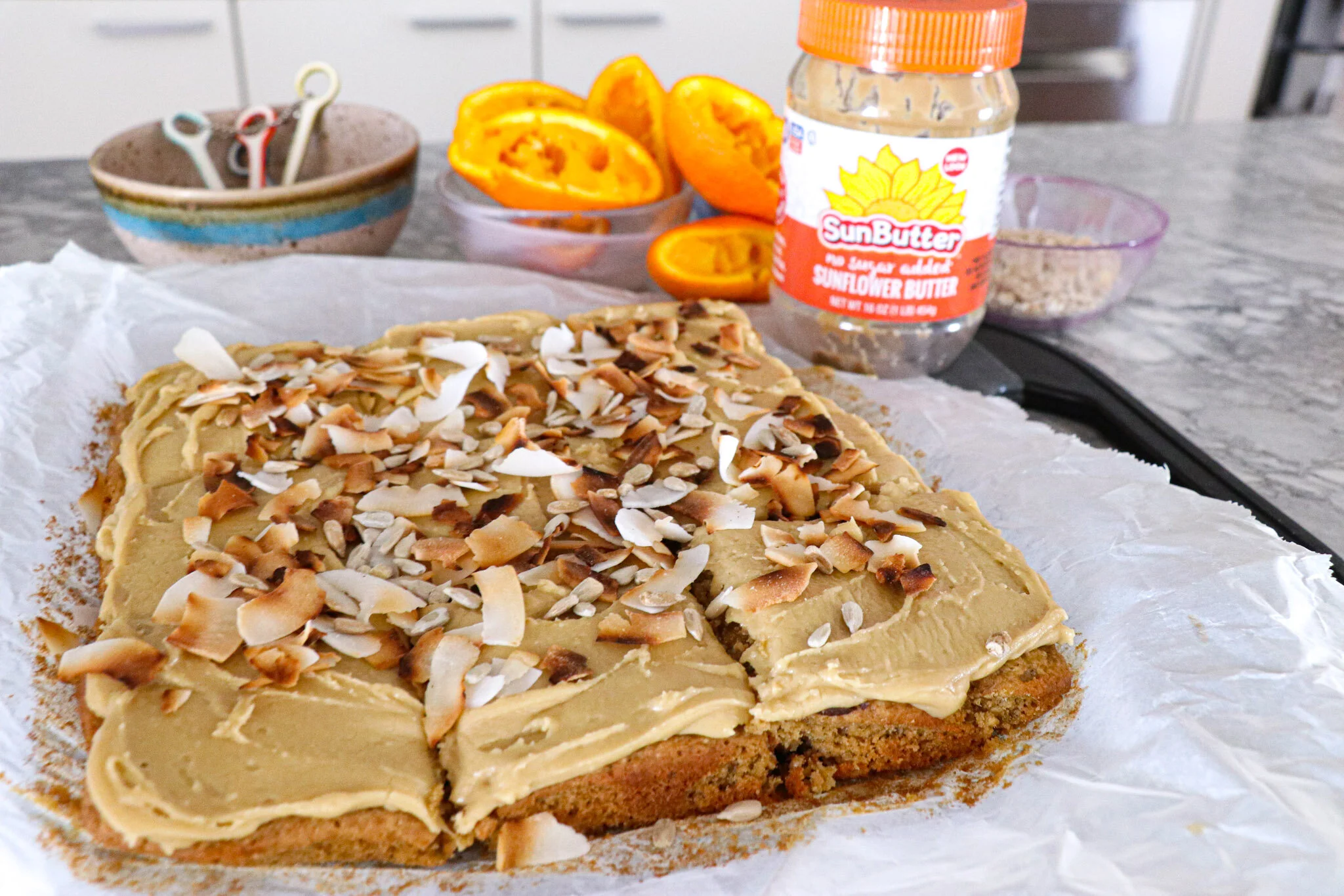 The aroma of this cake when you take it out of the oven is so fresh and spring-like, and it has a soft and tender texture. The frosting is thick and creamy, and more on the dense side. What I love about this frosting is that it’s intensely flavored by both the Sunbutter and the orange juice, and doesn’t just taste like sugar.