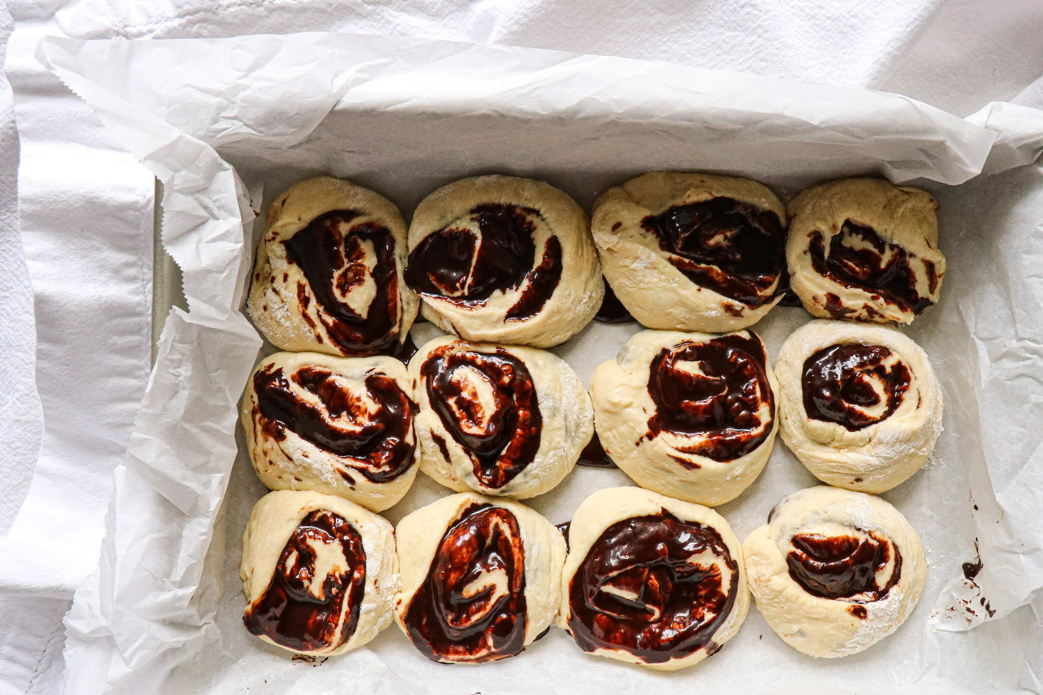 Begin rolling the dough along the long side until it has formed one long cylinder. Cut the dough into 1.5 inch wide sections. Transfer them swiftly to a rectangular cake pan lined with parchment paper, swirl side facing up.