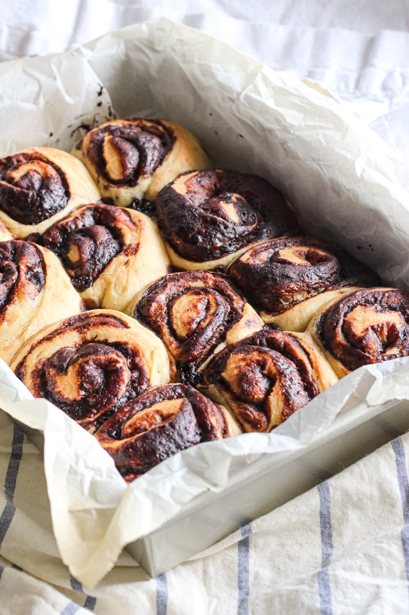These sweet buns are like cinnamon rolls, except with a divine cocoa paste filling. Layers of soft, fluffy, spelt flour sweet bread is rolled and smothered in chocolatey filling made from scratch. You can use this filling in other recipes as a frosting or glaze. The bread is so light and airy, making this sweet treat less rich than you might anticipate, in the best possible way. I think these buns are amazing as a breakfast treat.