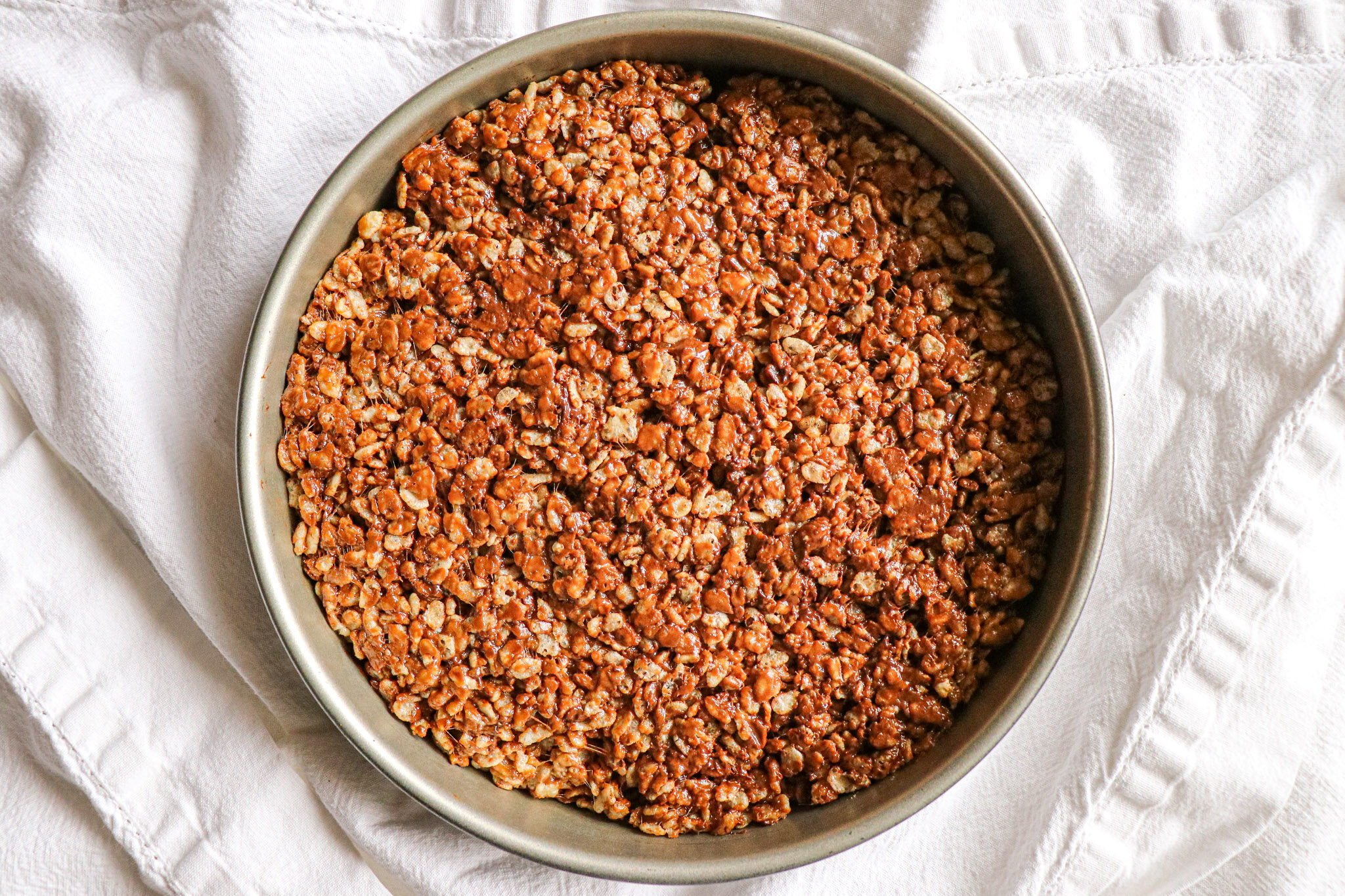 After folding in the cereal, simply press the mixture into a cake pan or baking dish and let set. Then cut into squares.